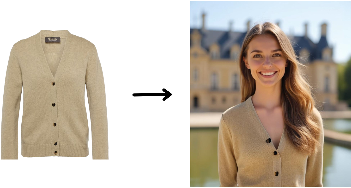 When you upload a photo of your clothing design, we use AI to generate photos of models wearing them in different settings.